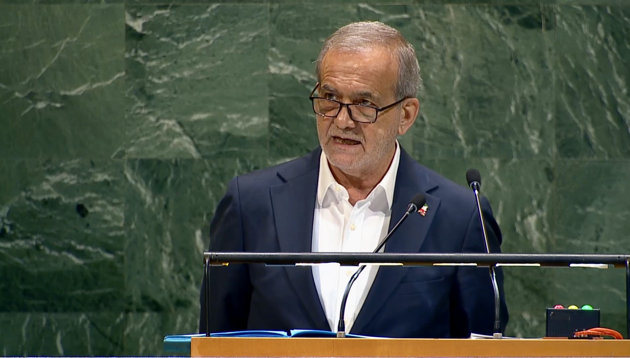 当地时间9月24日,伊朗总统佩泽希齐扬在第80届联合国大会一般性辩论上发言时重申,伊朗不会制造原子弹,也不会追求拥有核武器及大规模杀伤性武器。(央视记者 曹健)