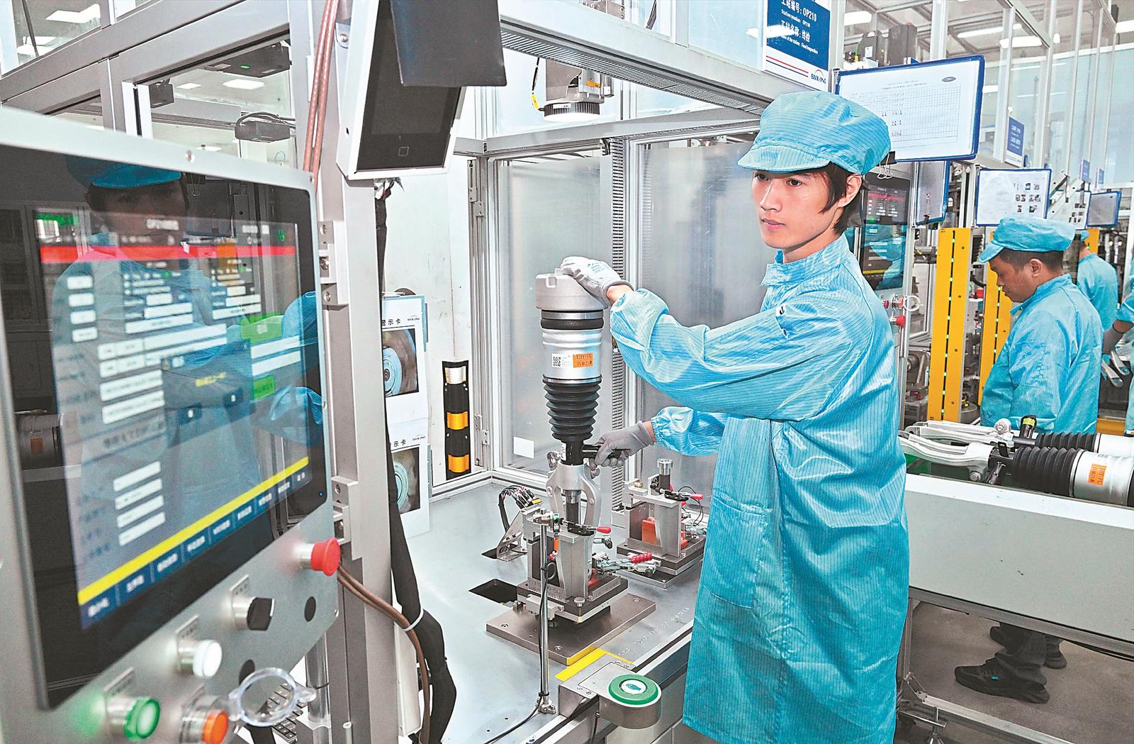9月10日,上海保隆汽车科技(安徽)有限公司,工作人员在检测智能空气悬架系统。