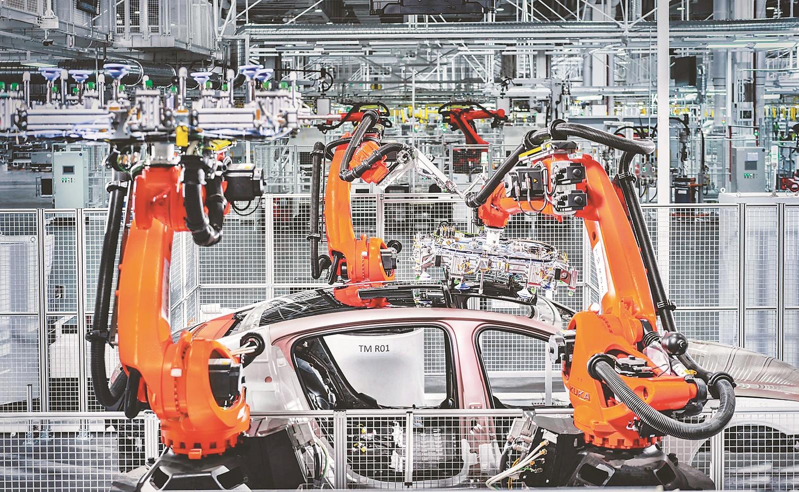 江淮汽车尊界超级工厂总装车间的AGV自动装配岛。