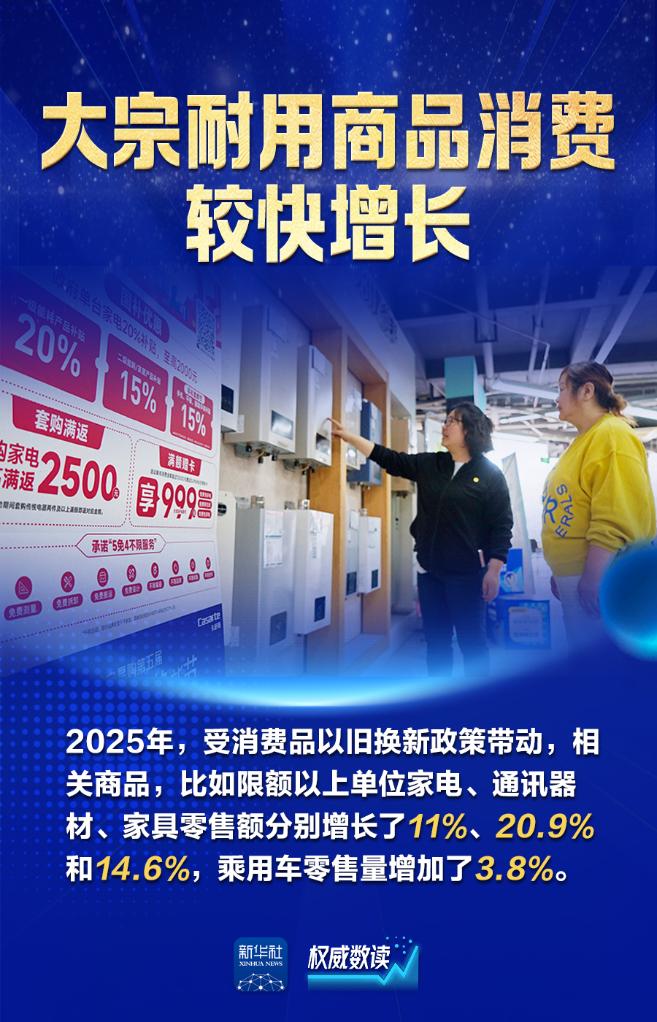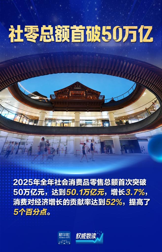 国务院新闻办公室26日举行新闻发布会,商务部相关负责人介绍2025年商务工作及运行情况。2025年,中国消费市场活力十足:全年社会消费品零售总额首次突破50万亿元;消费对经济增长的贡献率达到52%;“以旧换新”“中国购”“国潮文化”等成为高频词……消费持续发挥了经济发展主引擎的作用,也为世界各国提供巨大机遇。让我们跟随海报,一起来看。