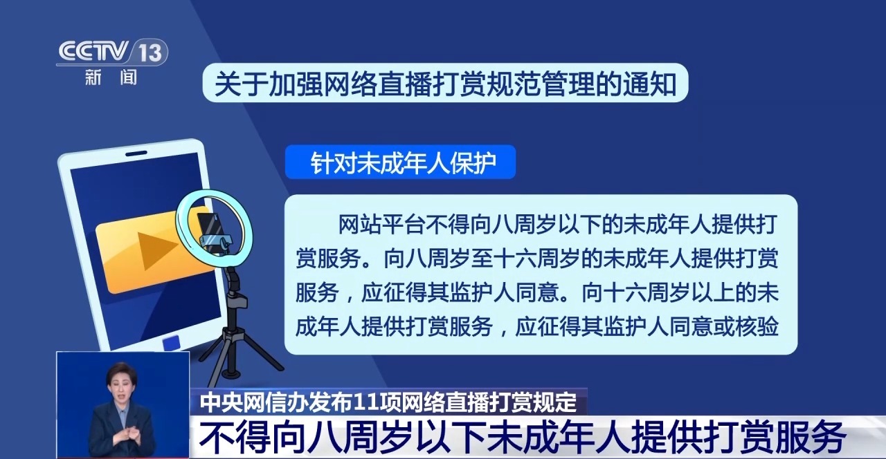 中国社会科学院大学互联网法治研究中心主任 刘晓春:这个通知的发布主要针对的还是直播打赏行业存在的一系列的乱象,特别是未成年人保护这一块,未成年人他在看直播的时候的打赏通常是跟他自己的认知能力和判断能力不相符的,那么特别是会出现这种非理性的,特别是高额的打赏,那么这一块平台和主播都可能存在引导和诱导的行为,这一类乱象也是比较突出的。