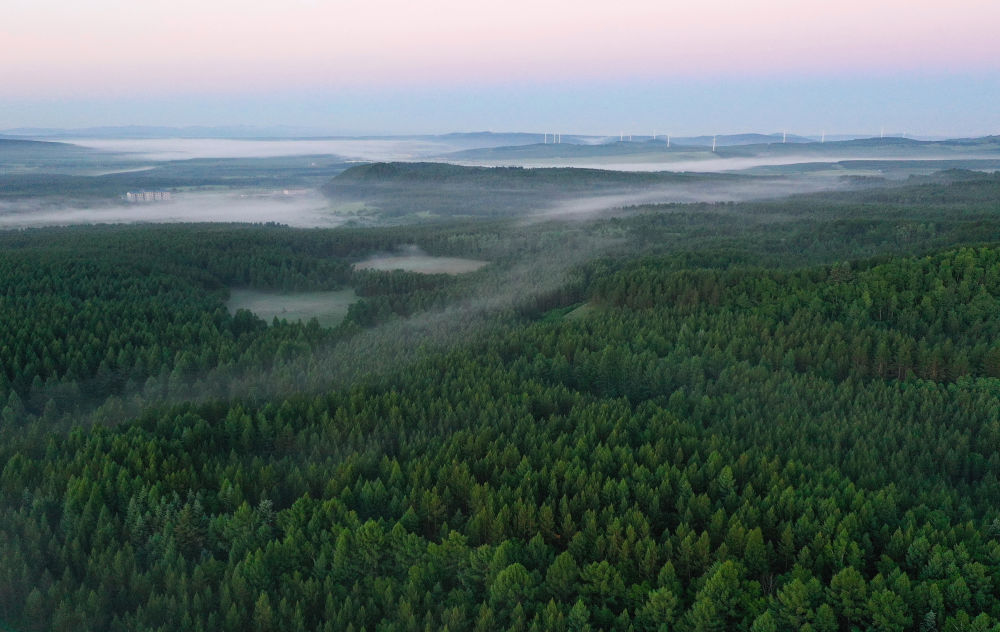 ↑塞罕坝国家森林公园晨景(2021年6月27日摄,无人机照片)。