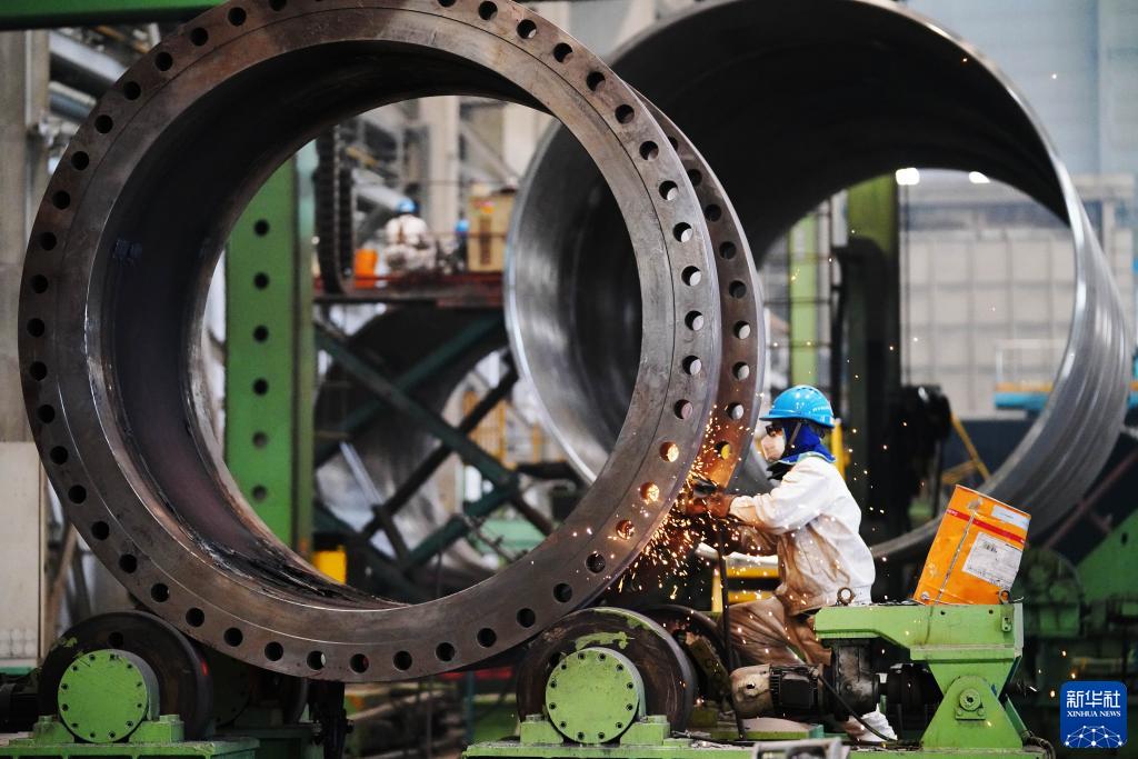 4月14日,在哈电集团哈尔滨锅炉厂有限责任公司车间,工人在进行生产作业。新华社记者王建威摄