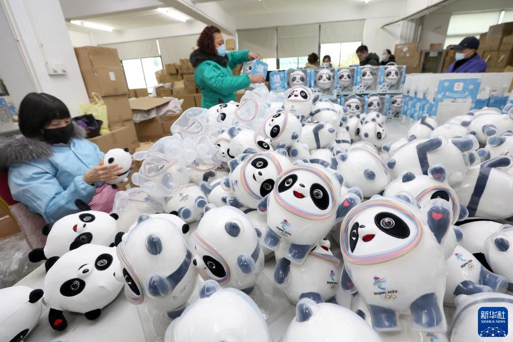 2月8日,工人在位于江苏省启东市的一家特许生产商的车间里包装“冰墩墩”。新华社发(许丛军摄)