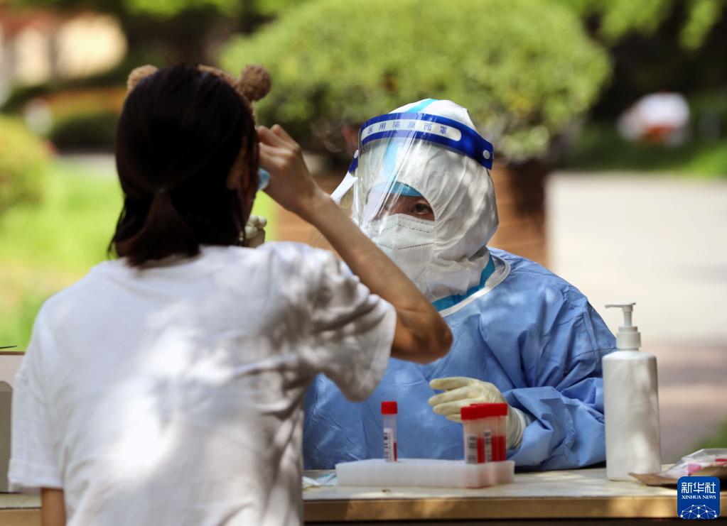 4月12日,在上海松江区一居民小区内,医务人员进行核酸检测采样。新华社记者刘颖摄
