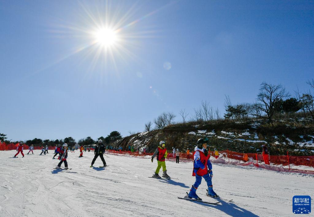 在天津蓟洲国际滑雪场,教练与小朋友在雪道上练习滑雪(2月20日摄)。新华社记者孙凡越摄