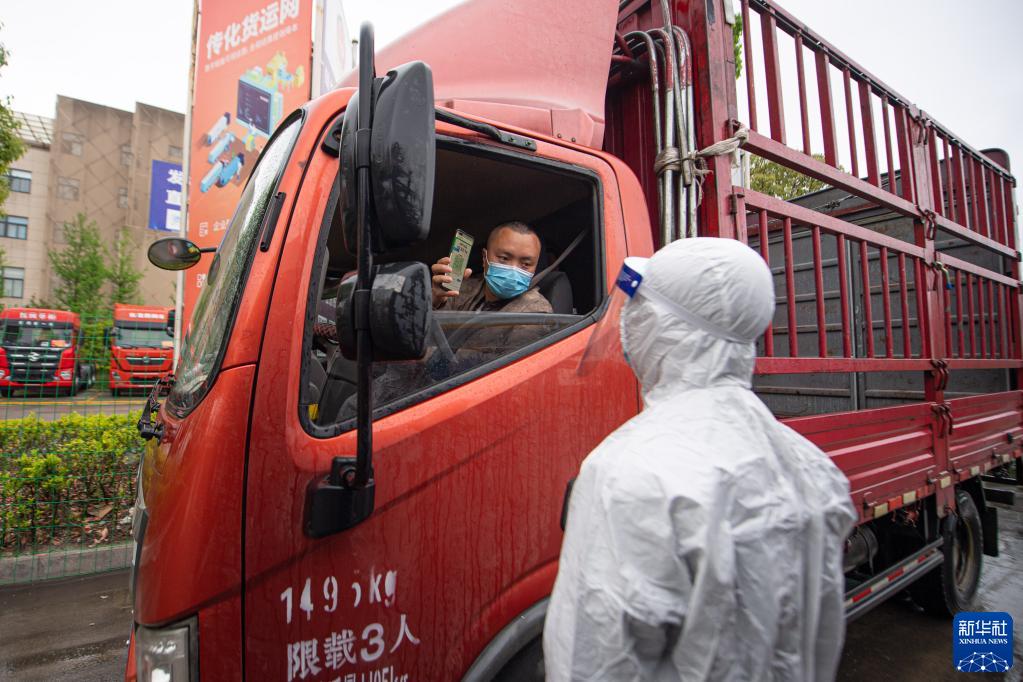 4月13日,工作人员查验驶入杭州传化公路港的货车司机健康码。新华社记者江汉摄