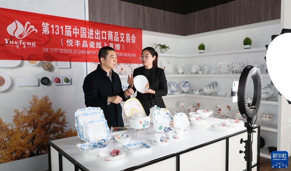 4月15日,第131届中国进出口商品交易会线上开幕。在江苏省淮安市洪泽区,一家陶瓷企业的工作人员在展厅直播介绍产品。新华社发(赵启瑞摄)