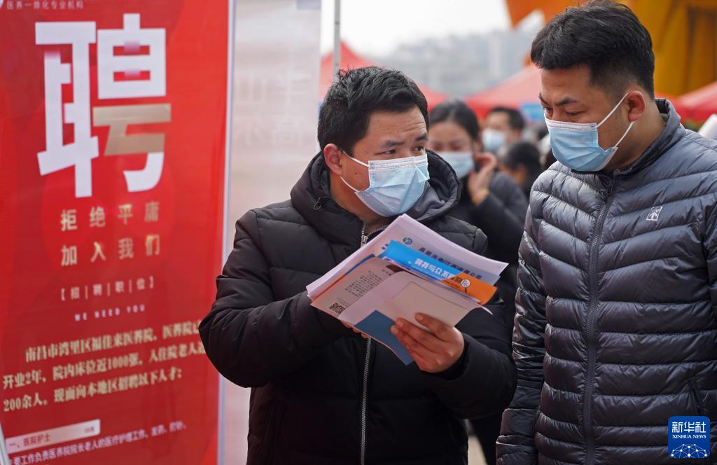 2月25日,江西省南昌市湾里管理局开展“春风行动”线下招聘活动。这是求职者在招聘会现场交流。新华社记者万象摄