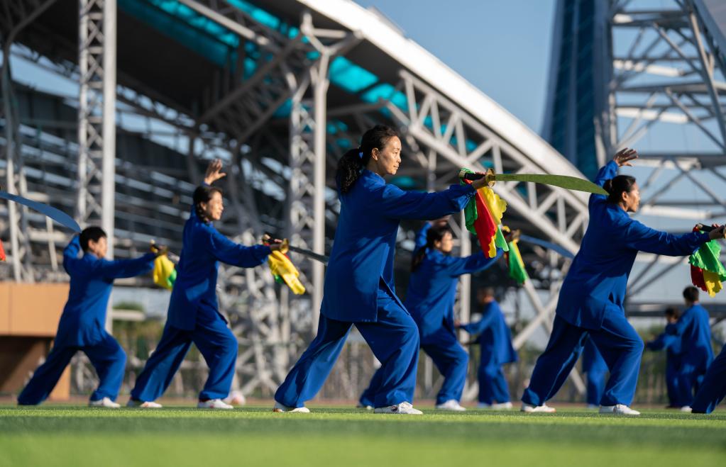 5月27日,市民在河北省黄骅市天健湖共享体育场练习太极刀。新华社记者骆学峰摄