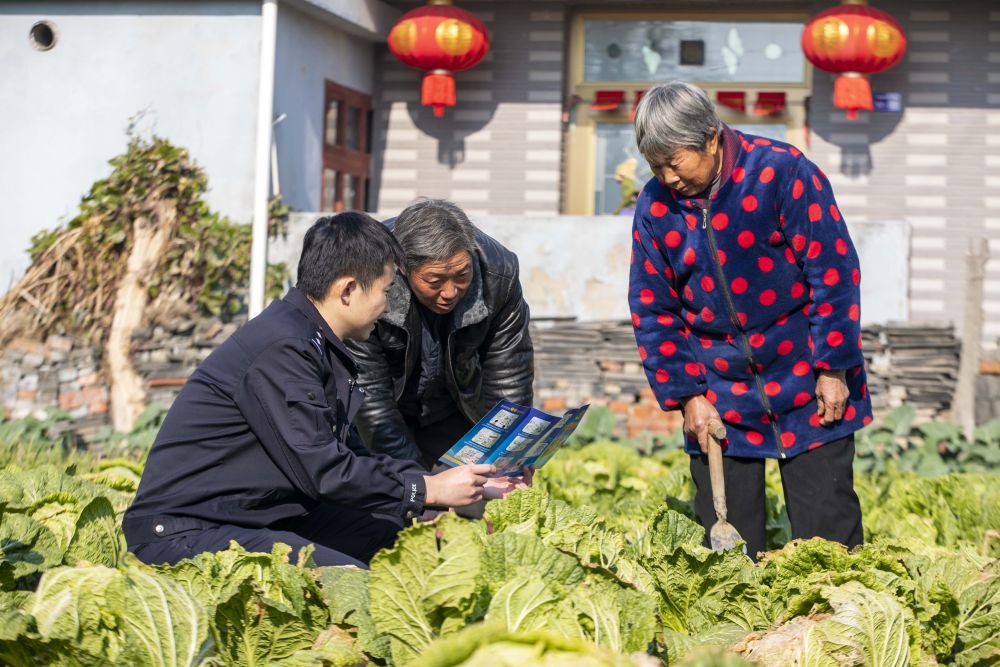 江苏省泰州市海陵区苏陈派出所民警在苏陈社区田间地头向农户进行普法宣传(2021年12月4日摄)。新华社发(汤德宏摄)