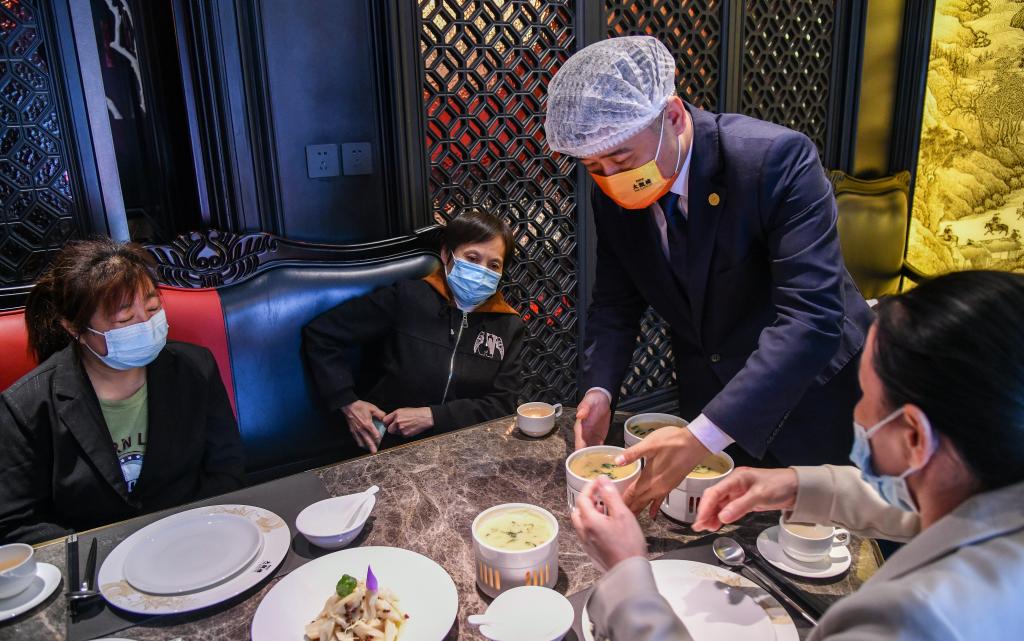2022年5月10日,在济南一家餐饮店内,服务员为顾客上菜。新华社记者朱峥摄