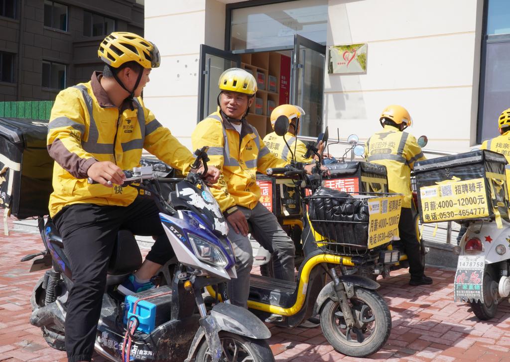 2022年8月31日,在山东省单县园艺街道黄楼社区“暖新驿站”门口,外卖配送员休息后准备出发工作。新华社记者徐速绘摄
