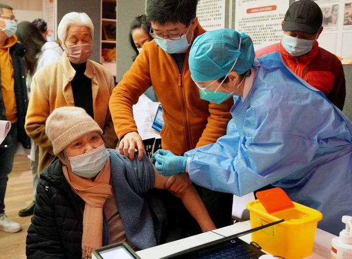 12月9日,在上海市黄浦区打浦桥街道大同居委会,接种小分队的护士在为老年人接种新冠疫苗。新华社记者刘颖摄