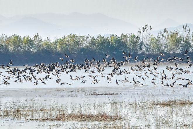 “来了,又一批大部队来了!”余永强忽然停下脚步,压低声音,手指向不远处的滩涂。顺着他的目光望去,黑压压的鸟群静静伫立在澄澈的湖水中,或低头觅食,或梳理羽翼。“这是小白额雁,最爱在咱们菜子湖的滩涂栖息。”