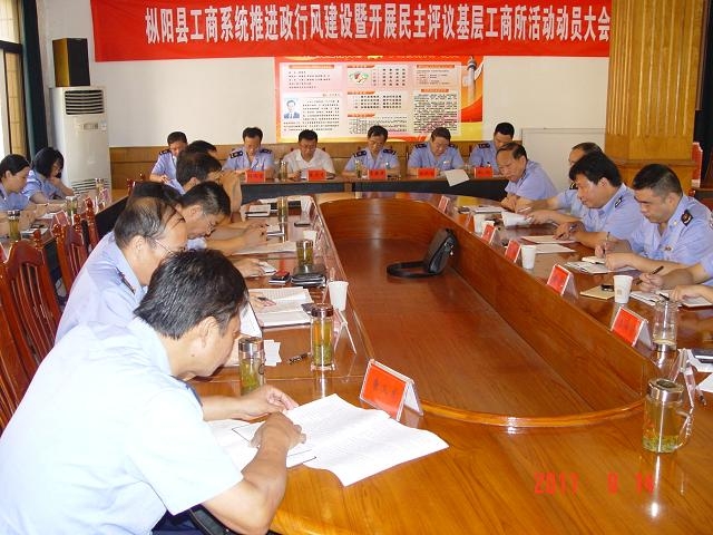 枞阳在线消息 9月14日上午,枞阳县工商局召开推进政风行风建设暨民主评议基层工商所工作动员大会。县政府纠正行业不正之风办公室副主任王成龙应邀出席会议并作重要讲话。机关各股室及直属、派出机构主要负责人和协会、学会负责人参加了会议。
