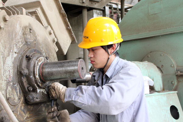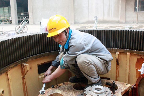 团结就是力量:制造一分厂维修班一直践行着群策群力、同舟共济的团结奋进精神。2011年5月份,公司一期2309原料磨辊皮单边磨损严重,影响主减速机振动及磨机产能发挥。当时受连续阴雨天气对物料输送的影响,均化库料位增长缓慢,要确保两条窑的正常运行,必须立即组织人员进行处理。公司及分厂迅速制定各项保障措施,为在最短时间内完成维修任务,维修班人员克服了现场作业环境较差、温度较高等不良条件,实行两班24小时交替作业,并群策群力,打破常规,利用矿山分厂汽修工具对磨辊螺栓进行拆卸,极大地的缩短了检修时间,全体员工步调一致相互协作,仅用20小时15分就完成了3个辊皮的翻边工作,提前了近4个小时,刷新了同类磨机辊皮翻边的最新记录!“齐心协力,共度难关”,这正是枞阳海螺全体维修人员缩影。