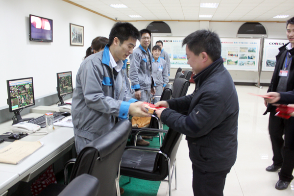 中夜班交接班之际,公司领导到现场为坚守岗位的员工送去新年的祝福和红包,祝大家在新的一年里身体健康,工作顺利,万事如意。