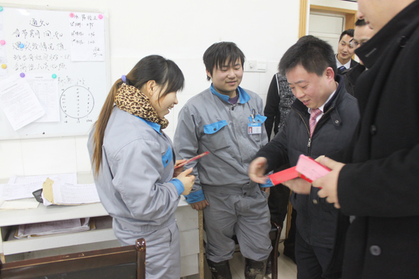1月23日(大年初一)早上,公司副总经理胡全干及值班的中层管理人员,到各部门拜年慰问,与留守工作岗位的员工亲切握手,互致节日的问候,给他们送去了新春的祝福,并和坚守岗位的员工进行座谈。