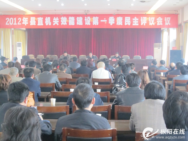 枞阳在线消息 2012年3月30日下午,我县在百川国际大酒店三楼会议室召开2012年县直机关效能建设第一季度民主评议会议。会议由县委宣传部副部长周剑斌主持,县纪委副书记、县效能办主任乔华雄出席会议并讲话,县纪委常委、县效能办副主任唐志刚出席会议,县效能办全体成员参加了会议。