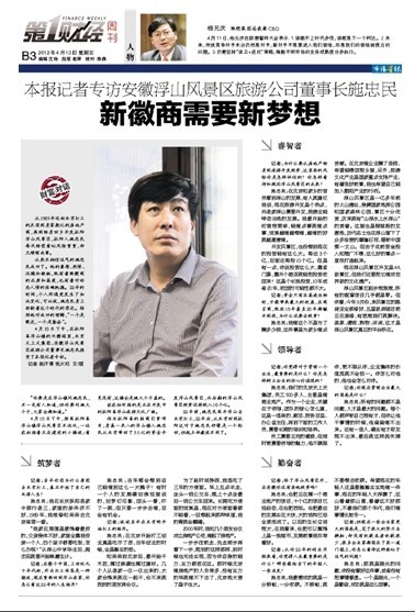 4月10日下午,在枞阳县浮山镇的双瞻阁里,北京天上天集团、安徽浮山风景区旅游公司董事长施忠民接受了本报记者专访。